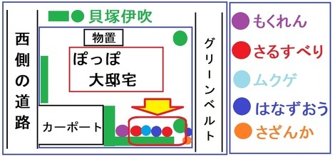 そこで、昼食後の午後1時10分過ぎ頃から3時45分過ぎまでの「約2時間半」、下の地図の「矢印と赤枠」のごとく庭の「さるすべり(2本)・ムクゲ・はなずおう・カイヅカイブキ」の剪定を完了しましたヨ!(´∀`)