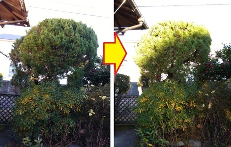 下の写真は庭の南東にあります「カイヅカイブキ」の剪定前後です。