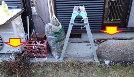 下の写真は「片づけ後」ではありますが「矢印」のごとく、まだ「さるすべりの種の片づけ」と「サルスベリの太い枝の束ね」などが残っています。