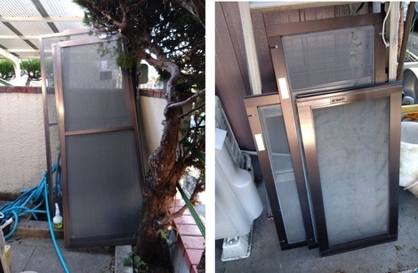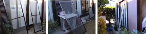 下の上段写真は今年は庭に干すことにしました「南の3部屋分の網戸(5枚)」で、下段写真は例年のごとく西に干しました「天袋の網戸(5枚)」です。