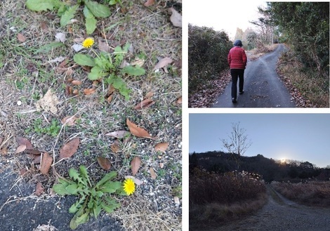 下の左写真はお隣の団地の出入り口に咲いていました「タンポポ」で、右上写真はお散歩の行きの「Y字路」右下写真は「合流地点」から振り返りましたら「夕日」が・・・!