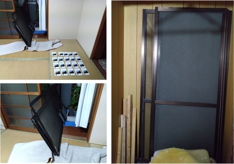 (「網戸」は南和室の「南廊下から部屋(下の左写真)」に入れまして、同じ南和室の「西廊下端へ立てかけ(下の右写真)」ましたヨ!)