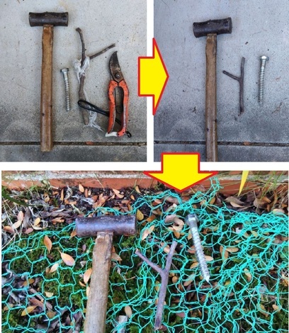 網戸を干しましたついでに「物置」にありました「ミツマタの枝」を金網に「棒」を立ててあります箇所に刺しなおしました。