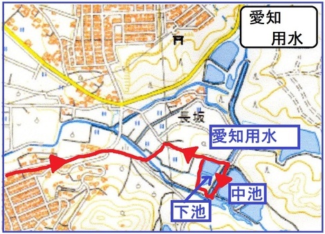 今日のお散歩コースは「午後2時20分から3時10分過ぎ」まで、下の地図の」[赤線]のごとく「ショートコース往復・中池・用水南から下池」でございました。
