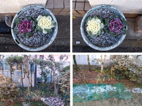 (下の上段写真は玄関の「葉ボタンの雪」ですので「葉ボタン雪」・・・なんちゃって!