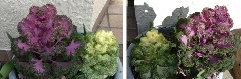 下の写真は玄関横の「葉ボタン」ですが、だんだん伸びてまいりました。