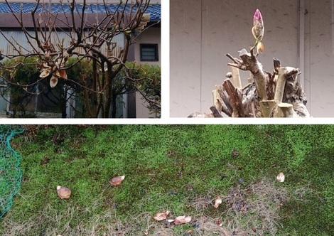 ハクモクレンの花はもう終わりで下段写真のごとく花弁が・・・シモクレンは「一輪」だけ蕾をつけましたヨ!^_^)