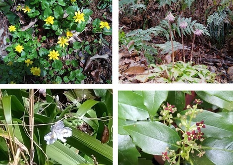 左下は「シャガ」で、右下は「アオキの花(だと思います)」です。