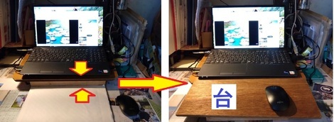 右写真はノートパソコンと「同じ角材(4cm)」の上に「ベニヤ板」を乗せたところです)