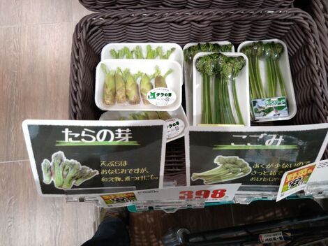 ドラッグストアでは下の写真のごとく「たらの芽」「こごみ」が売っていました。