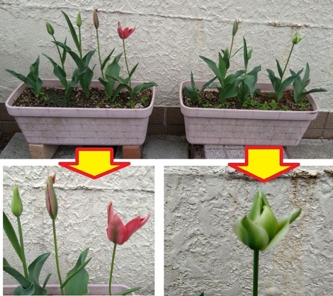 我が家の玄関前の2個のプランターには「昨年息子宅に植えましたチューリップの球根(おさがり)」を植えておきましたら、下の写真のごとく「蕾(つぼみ)」が・・・:^_^: