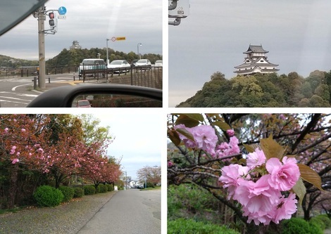 下の写真は元会社後輩宅からの帰り道で、上段は信号待ち時にパチリしました「犬山城」で、下段は「成田神社の八重桜」です。