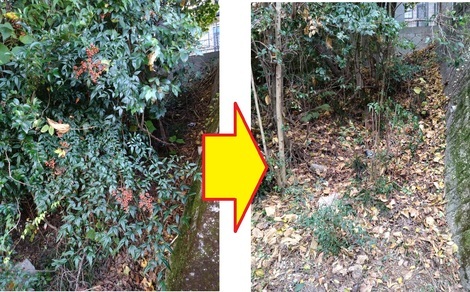 下の写真は歩道の脇に生えています「南天」なんですが、左写真は「南天の実(11月6日)」が生っていましたが、右写真(今日)では先日の「選定作業」で無残にも