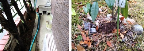 (下の左写真は「西のカイヅカイブキ」で右は「庭の金柑(きんかん)」です)