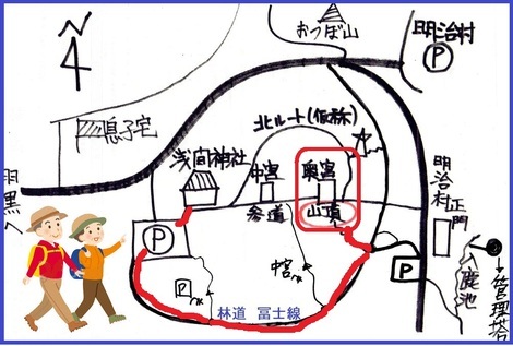 今日の「登山ルート」は下の地図の「赤線」のごとく、4回のお散歩コースの延長でございます。