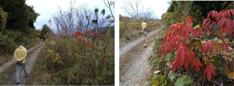 下の左写真はお散歩の行きで右写真が帰り道ですが両方とも「ヤマウルシの紅葉」が目立ちました。