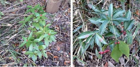 先日の「選定作業」で歩道脇の雑木をすべて刈ってしまいましたので、毎年「赤い実」を楽しみにしていました「千両も万両」もほとんど刈り取られてしまいました。