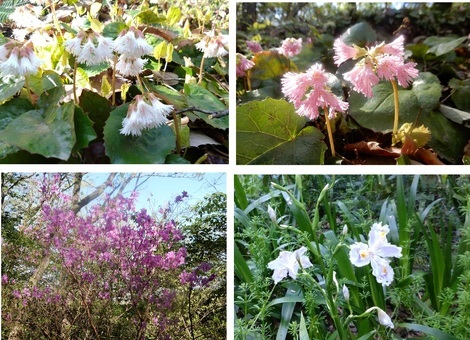 下の上段写真は浅間神社駐車場の「花桃」で、下段写真は「イワカガミ」の近くに咲いていました「ミツバツツジ」です。