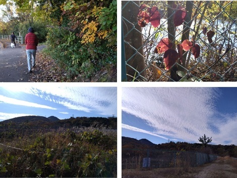 左下は農道の「イチョウ」ですが、もうずいぶんと葉が落ちてしまいました、右下はお散歩の「帰り道(ショートコース)」で紅葉していますのは「ヤマウルシ」でしょうか?