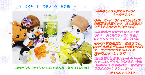 奈良のゆめるくん@ろ~たすさんから 御当地では 幻とされているなかなか手にはいらないイコマ製菓のレインボーラムネと 恒例の不思議な柿シリーズに 女子力アップ の抹茶フェイスパック ^^ が 届きました。 ゆめるくん おねえちゃん達 ろ~たすさん どうもありがとうございます♡ (ゆめるくん 食べていい? あ~~ん (^O^)♡