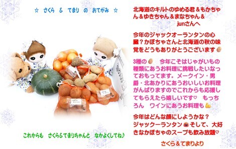 📩 junさんへ ゆきちゃん 20歳のお誕生日おめでとう♡ 引っ越しでいそがしいなか junおねえさん 登校してくれてどうもありがと♡ じゃがいも たまねぎ そして ジャックオーランタンの種?🎃 今年もありがとうございます。笑顔になってもらえるように がんばります。ほりほり ほりほり 10月におひっこし しばらくは いそがしいよね。ハロウインパーティー さんかできるかな? そして ブログ20周年記念おめでとうございます♡ junさんが ブログ始めてくれていなかったら きっと出会えなかったかも。 ゆめるくん これからも さくらちゃん てまりちゃん くらちゃん♪と なかよくしてあげてね。出会えたおかげで刺繍も上手になれました。わからなくなると リアルタイムでおしえてくれた あの時代 すんごく すごく嬉しかったです♡