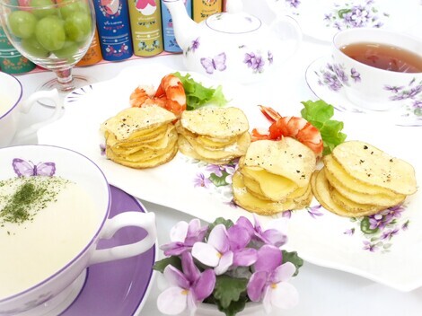 hijinのおねえさんのお爺さまのお友達の農園で採れた葡萄さんを あたらしく家族になった カスター君の名前にちなんで 蜂蜜カスタードクリームとシャシンマスカットのタルトに 北海道のキルトのゆめるくんから とどいた 秋の味覚を つかって 山羊のチーズとじゃがいものスープに 檸檬とコリアンダーと黒粒コショー味のからあげ(新作味👍がんばった)そして なんといっても これこれ じゃがいもとオレガノ入りのクリームチーズのミルフィーユ(推し✨作家さんの作品に登場する一品)を。 お引っ越し準備で10月にはいると当分はいそがしく あそびにこれないjunおねえさんたちのために まずは がっつり 肉! 栄養いっぱいつけて の気持ちをこめて。