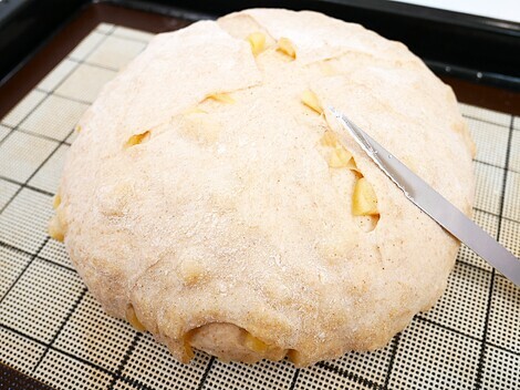ひさびさのパン あまりこねないバージョン(年末年始の3ヶ月予約がやっとおわったけど腱鞘炎がなおるまえにふたたび痛み強化。でもね パン つくらなくっていいよっていわれちゃうんだけど つくらなければストレスのほうが満タンになっちゃうんだよね。だから こねなくってもおいしくできたパンの方法をとりいれて) うふふ やっぱり パン台にパン生地があるところ 幸せ~♡ そして りんごをちょっとシロップでフライパンでさっと絡めて(色止めぐらい) ごろごろっと) りんごがあるから てまりちゃんがいる🍎(笑)