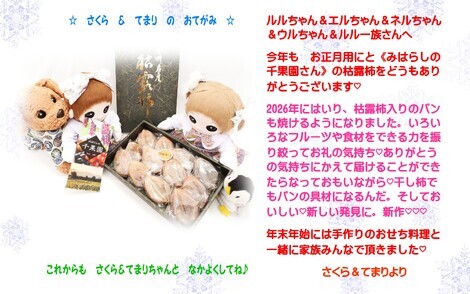 実は 先月末 ルル一族家からとどいたみはらし農園さんの枯露柿を まちがえて むか新さんのって かいてしまっていたの💦 なので あたらしく。ちょっと文面も変えてあります。 びっくりしたよね。ごめんね 間違えちゃってて。 まだちょっと冷凍庫に保存してあるので余裕があるときになにかつくろうとおもってます。たのしみにしていてね。そして まちがえちゃって ゴメンナサイ。