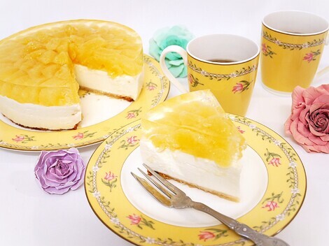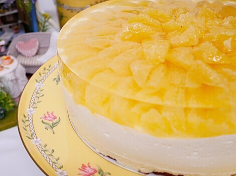 ヨーグルトチーズケーキ部分が ほどよく固まったので じゃ~ん はるか🍊登場!! みんなのおかげで アガーという存在をしり より透明感のあるスイーツがつくれるようになりました。