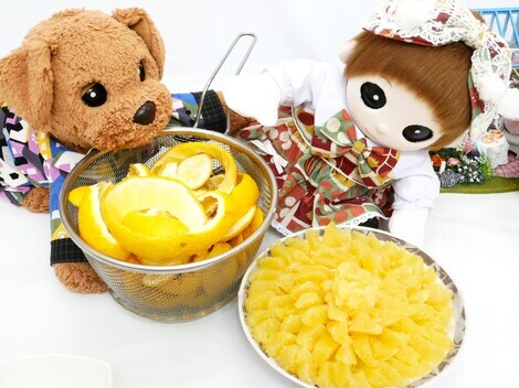 ちょうど 一週間前 姉の心がバテバテなときに のこっていた はるか🍊 を てまりちゃんとてま姉がせっせと せっせと 楽しそうに 剥いてました。 スイーツにできそうにないかな?って おもったふたりは せめて ちょっと 驚いてもらえるように かんがえた先がここ 前回タルトをつくって おいしかったけど さすがに また タルトだったら? つまんないかな?って おもいながら 剥いていたら とっても たのしくなっちゃったみたい。 まあ お口に入る方が多そうだけど。