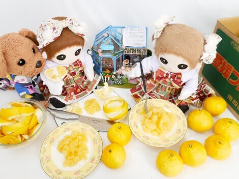 むすんで🍊(乂'ω')ひらいて🍊ヽ('ω')ノ手をうって('ω' ノノ")🍊むすんで('ω'乂)またひらいてヽ('ω')ノ手をうって('ω'ノノ")その手を...('ω' )う、う...\( 'ω')/🍊🍊大量だぁ!! まずは むいてむいて むいていて たのしぃ🍊酸味がないのに おいしぃ。あ! さくらちゃん それ たべすぎ。夢♡café☆彡に もっていくまえに 味見しなくちゃね。