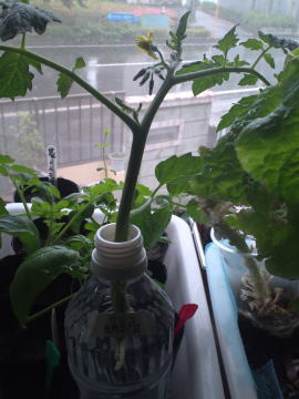 パイプ水耕栽培曹の凛々子のわき芽をペットボトルに水をいれてさし芽にしました。既に根が出てきていますが、まだ短いので後一週間程度待ちます。