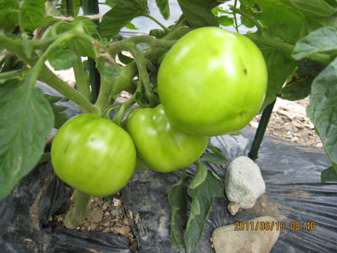 6月17日ぜいたくトマトがほんのりと赤みを増してきた。初めて作るトマトなので美味しいといいなぁと今からあれこれ話している。脇目をだいぶ増やしているので