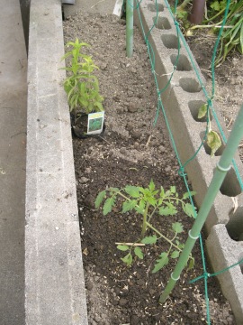 キュウリを植える予定の場所なので、ネットはそのままにしています。奥の空いている場所へは、「ももこ」のわき芽を植える予定です。また虫除けの為、バジルを置きました。-