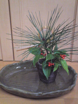今年のお正月には、久しぶりに花を活けてみました。自宅の庭先からとってきた、松と千両の小枝に、母から貰った水引を添えました。下皿は、母が創作した焼き物です。