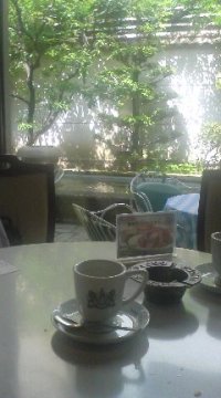 カフェの窓際からそそぐ光とカップに出来る影。そして外にのぞく緑に和みます。この感じ、好きなのです。(京都イノダコーヒー本店にて)