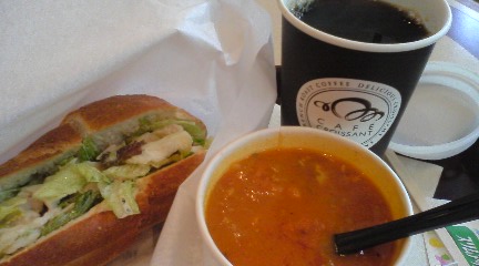 前日に引き続き最近気に入りのカフェにて。シーザーチキンサンド(ここのパンの食感が好み)スープ(マンハッタンクラムチャウダー)コーヒー(忘れないように飲みきり!)