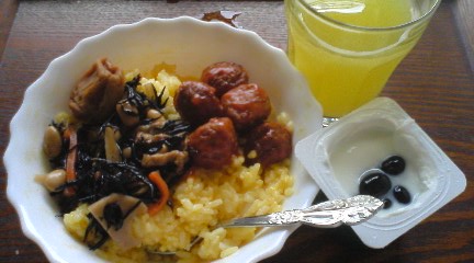定番、やや質素に。卵かけご飯+ミートボール+ひじき煮ヨーグルト+黒豆オレンジジュース