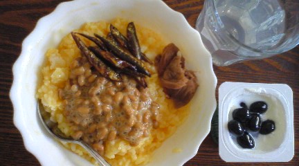 定番の朝食卵かけご飯納豆+ワカサギ佃煮+手作り梅干ヨーグルト+黒豆水
