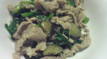 日曜は、スタミナを意識した料理にします。メイン:豚肉と野菜の炒め物(豚肉、ゴーヤ、ピーマン、ニラ、ナス)