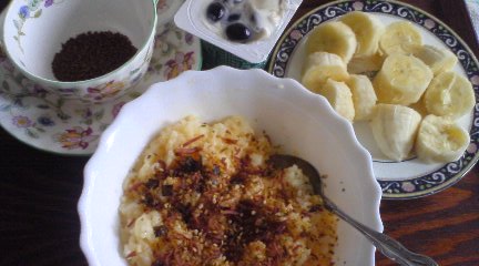 卵かけご飯+ふりかけバナナコーヒー(インスタント、お湯入れる前)黒豆ヨーグルト
