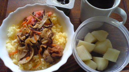 やはり朝の光で撮ると美味しそうに見えるかも。卵かけご飯+根菜のきんぴら+梅干+焼明太子洋ナシヨーグルトコーヒー
