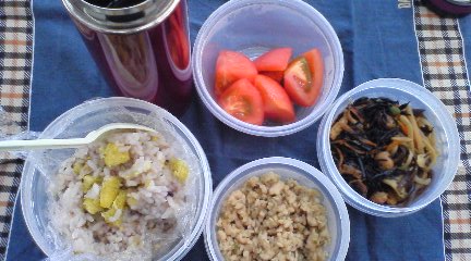 食物繊維とビタミンを意識した弁当です。鶏そぼろ煮(ネギ、舞茸入り)雑穀米+サツマイモご飯トマトひじき煮コーヒー(インスタント)