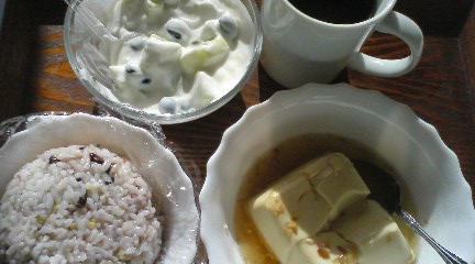 朝食の定番メニューに、湯豆腐参加。雑穀米湯豆腐(ダシ、生姜、茗荷)ヨーグルト(キウィ、黒豆)コーヒー(インスタント)