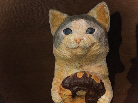 木彫作家花房さくらさんの作品です大阪の蔦屋書店での個展で撮ってきました大きさは実物の猫よりもひとまわり大きめですクレープ、美味しそうですねドーナツの代