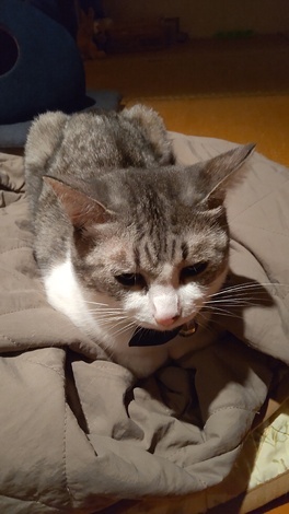 ミネルは、連日の暑さで、冬用の猫ハウスには入らず、キルティングのコートの上が今のお気に入りの場所になっています~🧥😽