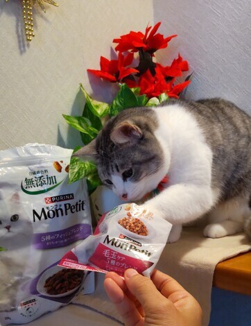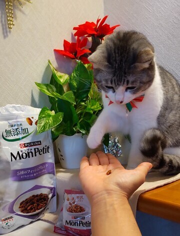 猫のミネルは、クリスマスイブなので、朝から大好きな「モンプチ」を食べ放題しています