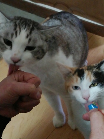 この写真は2021年グーちゃんと一緒の時です。ちゅ~るが大好きですね。(o^―^o)ニコ