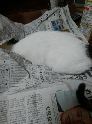 おはようございま~す寒いです。炬燵から出られません(⌒∇⌒)新聞に頭を突っ込むマリさん。。グーちゃんが、お空に旅立ち、念願の場所で、まったりするマリさん