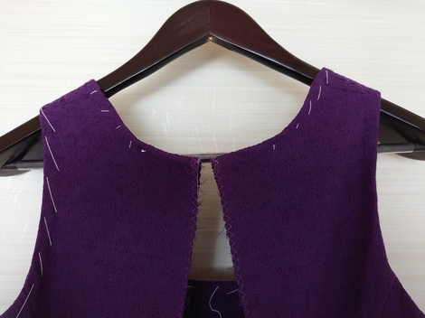 ノースリーブ、ノーカラーです。やりかたは、ユーチューブで懇切丁寧に教えてくれる動画があったので見ました。画像は、後ろから見たところです。見頃は、接着芯をはって表地と同じ布が裏布になってます。スカートはタックをとってます。コンシールファスナー付けが、😰😰😱うまくいくか、心配😢